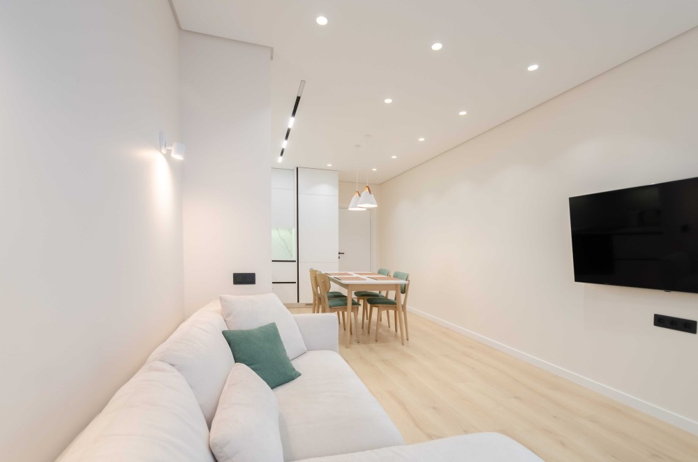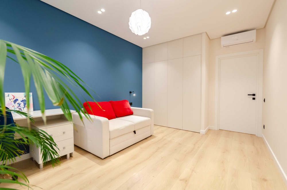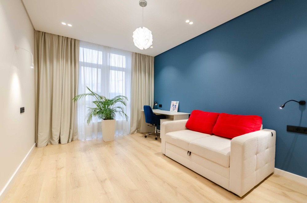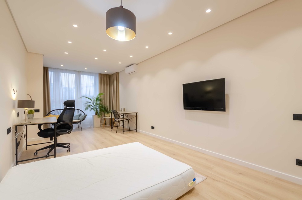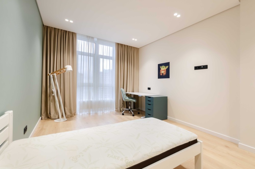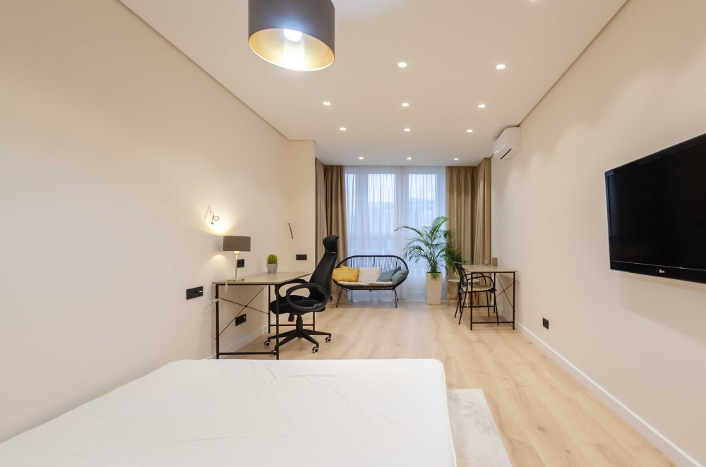 Загалом квартира має дуже хороше планування одне з найкращих у цьому комплексі - кухня- вітальня з комфортним та якісним диваном та телевізором, місце, де Ви можете відпочити самі або прийняти гостей. Всі 3 кімнати відокремлені. В кожній кімнаті є кондиціонер, меблі, робоче або навчальне місце та місце для речей(це великі шафи).