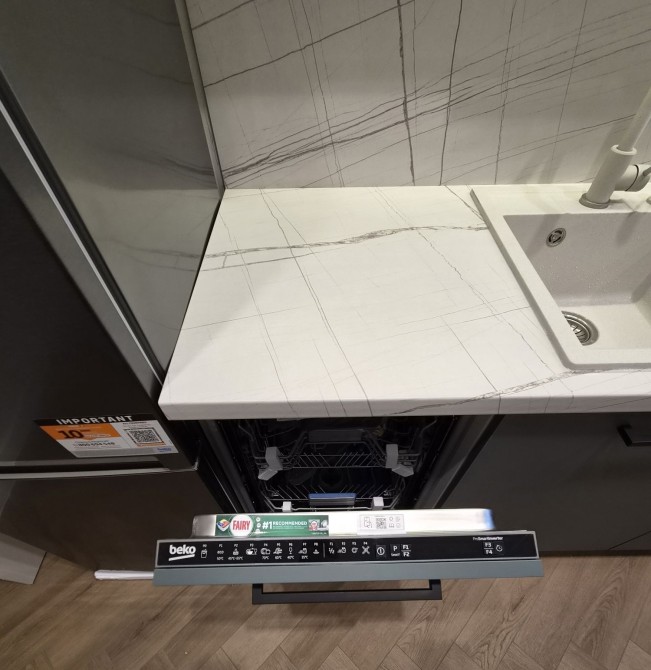 Квартира повністю укомплектована: посудомийна машина, плита, витяжка, духова шафа, бойлер, пральна машина, холодильник, вбудована кухня. У спальні — двоспальне ліжко з підйомним механізмом, 1 вмістка шафа.