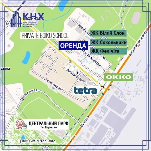 • Локація: приміщення на першому поверсі у спальному районі серед забудови житлових висотних будинків, поруч авторська школа Бойко, преміум фітнес-клуб Тетра, ЖК Фелічіта, ЖК Білий слон, ЖК Сокольники, центральний парк відпочинку ім.Горького та ін.