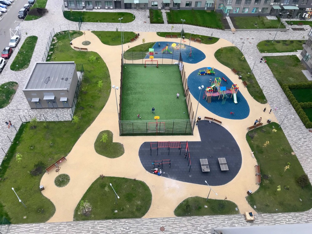 Для затишку та комфорту закритому дворі є штучне покриття футбольного поля, мʼяке покриття дитячих та спортивних зон, автополив газонів.