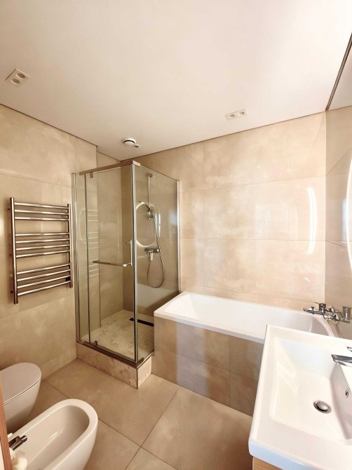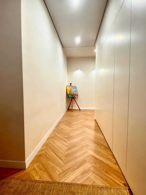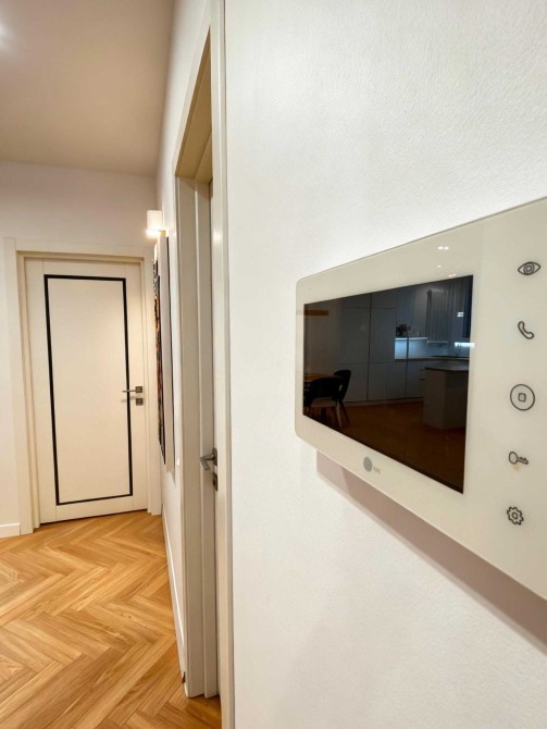 У квартирі передбачено багато місця для зберігання речей. У зоні кухні та вітальні програмована тепла підлога. Є вся необхідна техніка: вбудований холодильник, духовка, варильна поверхня пральна та посудомийна машини, кондиціонери.