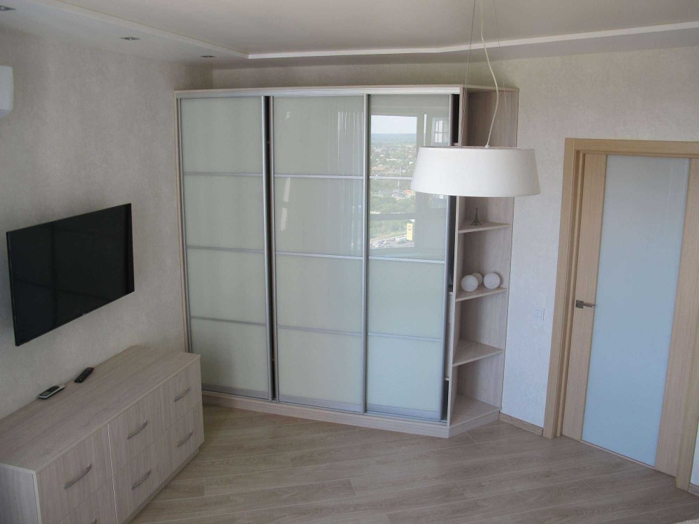 В кімнаті двоспальне ліжко та вбудована шафа купе