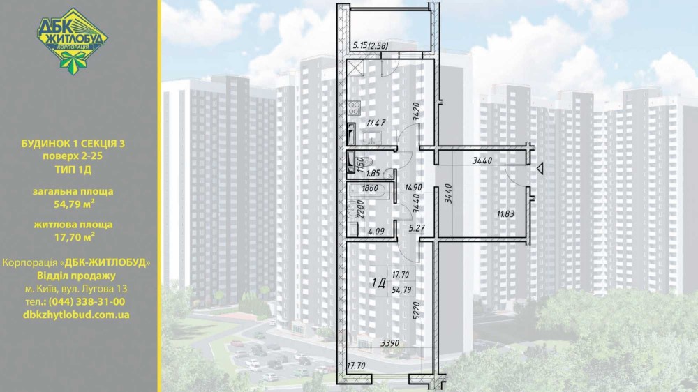 Площа квартири: 54.79/17.70/17.67;