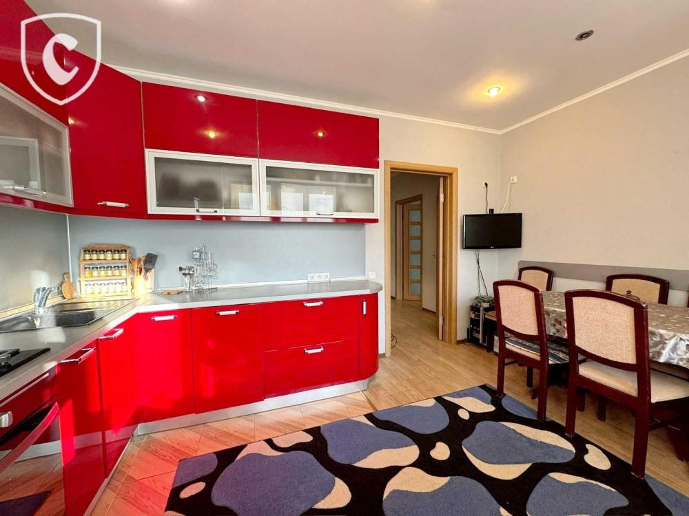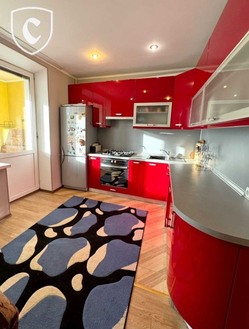 Кухня 12.1 м², оснащена технікою і меблями: холодильник, газова поверхня з духовою шафою, витяжка, посудомийна машина; з виходом на лоджію