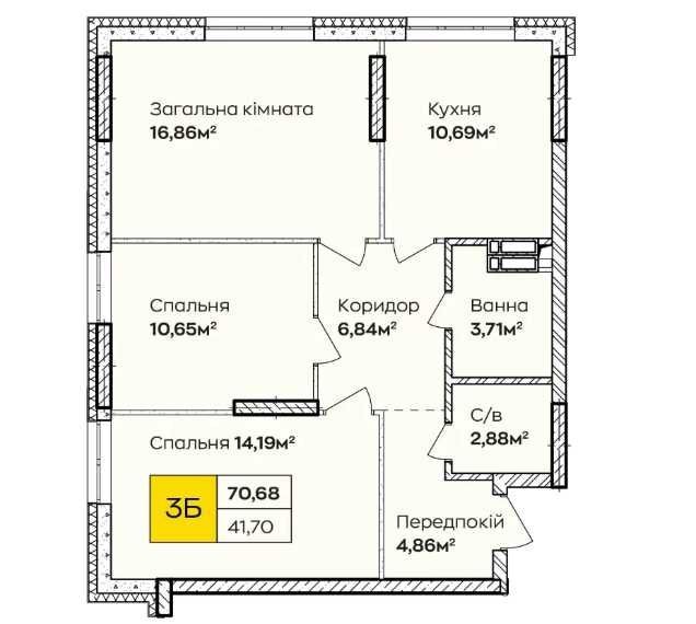 3-кімнатна квартира площею - 70.68 м², 11 поверх,