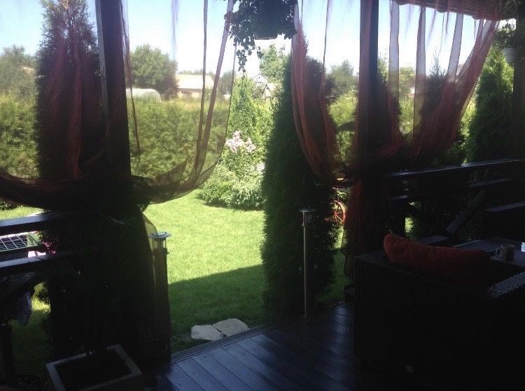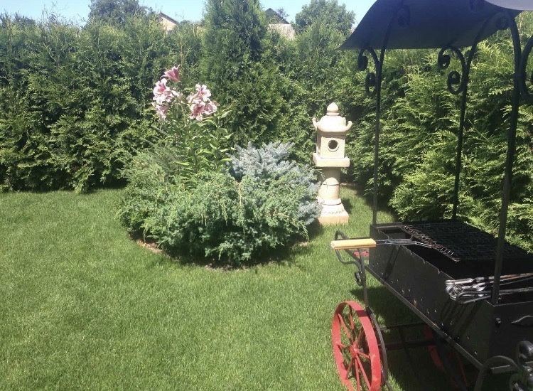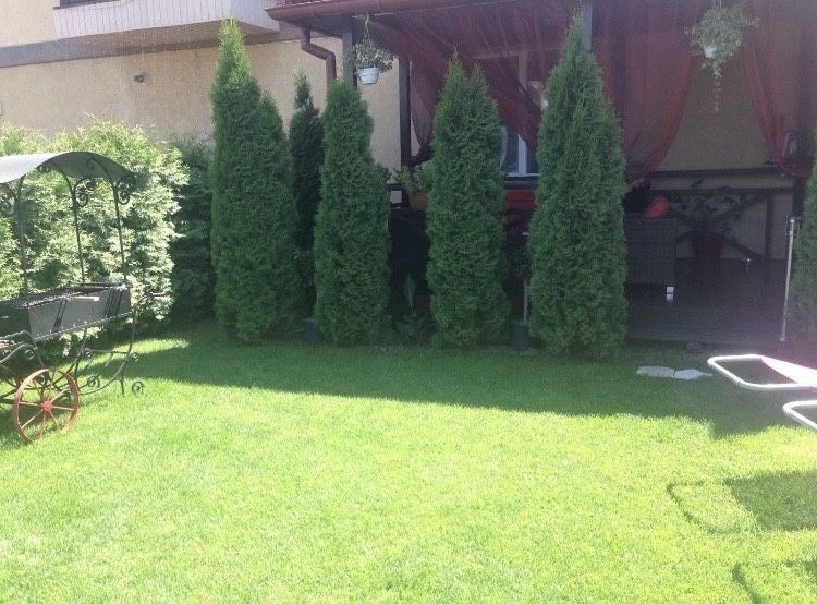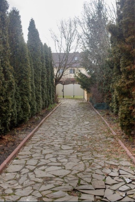 Перший поверх - коридор з великою місткою шафою купе, санвузол з ванною та душовою кабіною, спальня, вихід на криту терасу з садовими меблями, вихід на задній дворик, ділянка обсаджена туями та ялинками - живий вічно зелений паркан.
