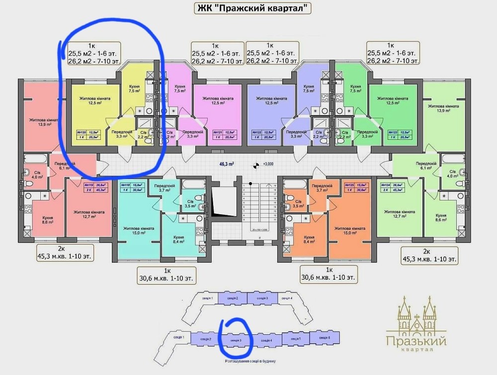 Квартира знаходиться на 10 поверсі, 3-го будинку в 3-тій секції.