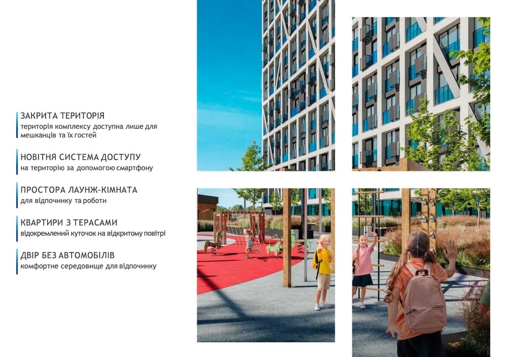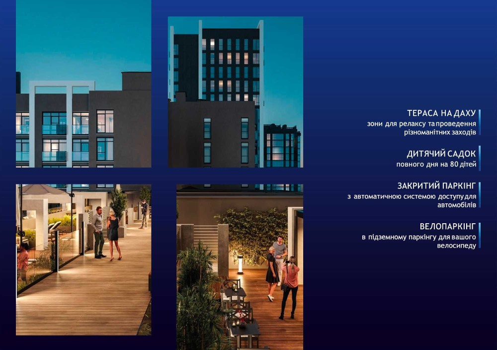 - лаунж-простір на даху одного з будинків, звідки відкривається чудовий краєвид на Печерськ та велика внутрішня лаунж-зона для мешканців комплексу;