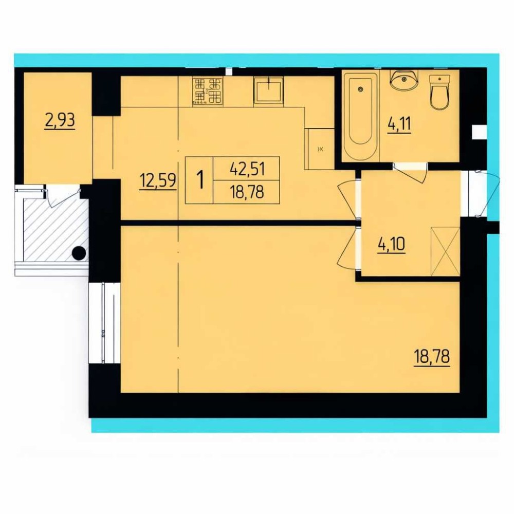 • Общая площадь 42.5 м2
