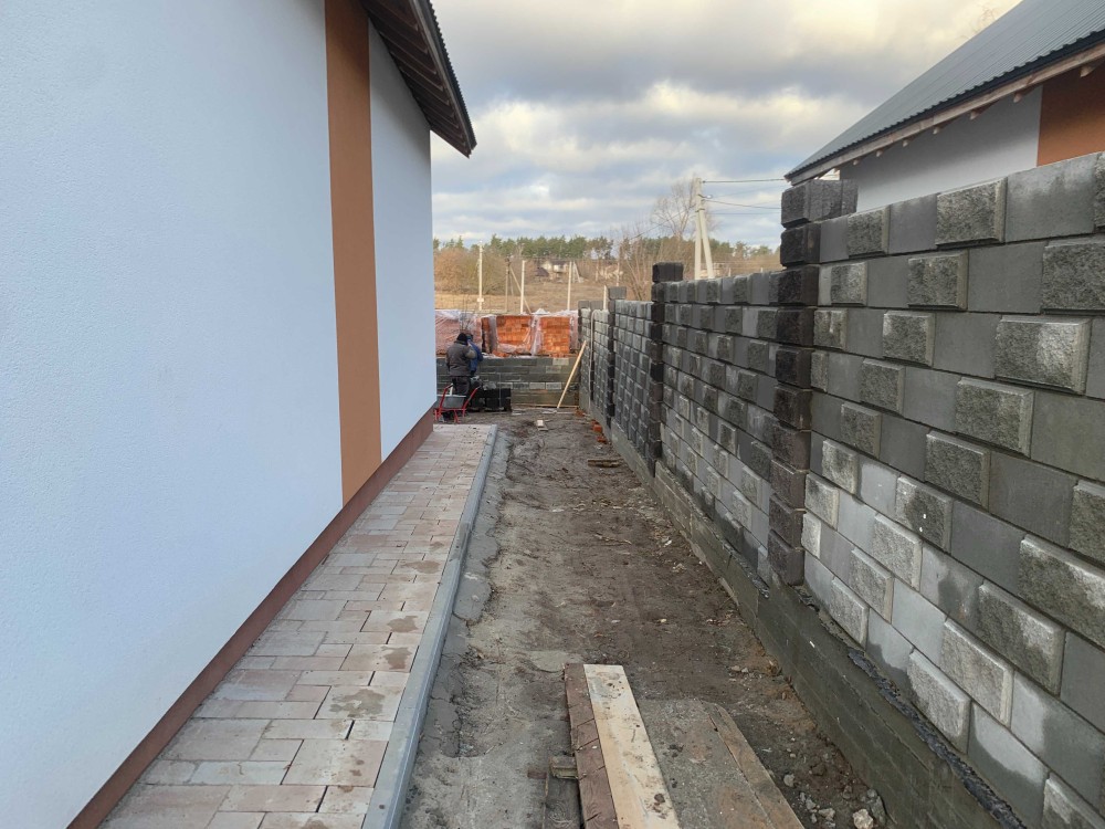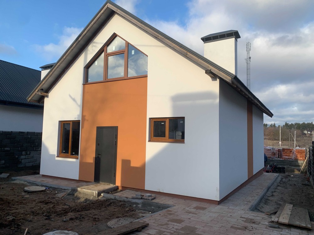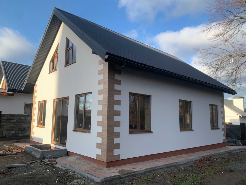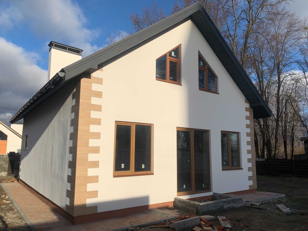 Фасад - утеплювач 50мм, декоративне оформлення фасаду, акрилова штукатурка. Відливи металеві на зовнішні сторони вікон.
