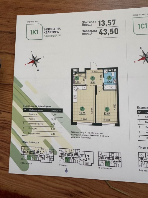 ЖК Варшавський 3 Будинок 10.3 Загальна площа 43,5кв.м. Кімната має площу 15.52 кв.м., кухня-вітальня -16.70 кв.м., ванна кімната - 5 кв.м., коридор - 4,29кв.м. гардиробна 2,91кв.м. Санвузол суміжний. Вікна виходять в двір, гарний краєвид.