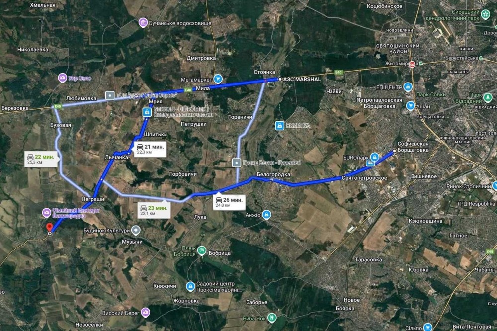 2. При заезде через Бишевскую трасу Бишів (та, что идет из поселка Святопетровское Святопетрівське и Белогородка Білогородка) вы увидите живописные холмы поселка Горбовичи Горбовичі и Музычи Музичі, красивые озера в поселках Бобрица Бобриця и Заборье Забір’є. Прогуляться по сосновым лесам в 5 мин. от дома вы сможете в поселках Петрушк