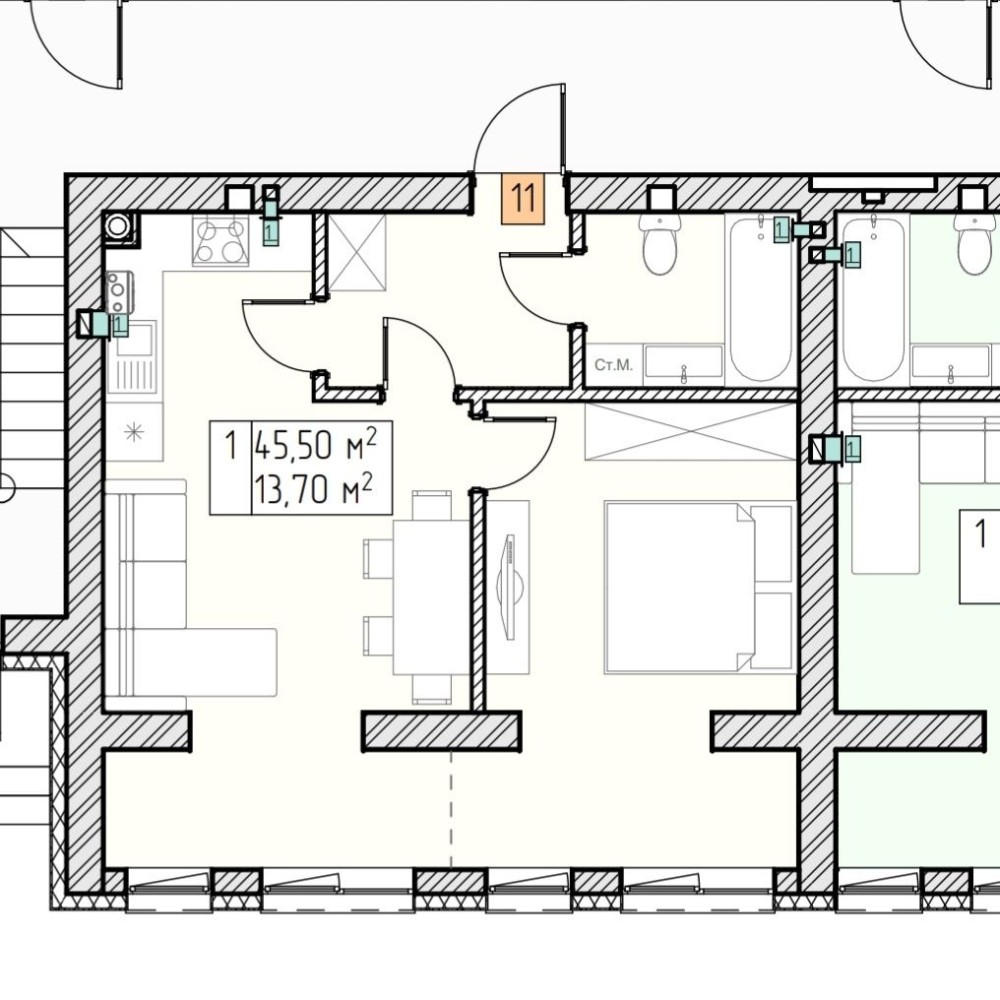 • Общая площадь 45.5 м2