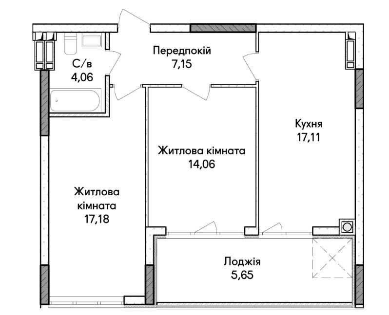 Квартира має комфортну площу для сім’ї: окрема спальня, велика кухня-вітальня для спільного відпочинку, місце під гардеробну або робочу зону.