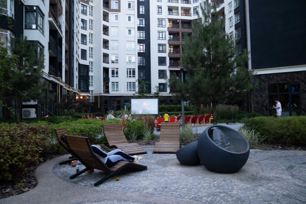 Територія комплексу закрита, з відеонаглядом, дитячими й спортивними майданчиками, кав’ярнями та магазинами. Поруч — набережна для прогулянок.