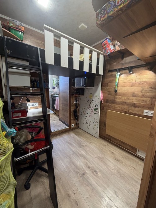 Там,де була кухня, облаштували дитячу кімнату із вбудованим ліжком під стелею та робочою зоною для навчання.
