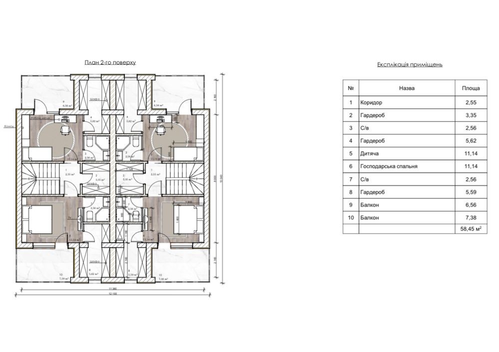2 поверх – три спальні, санвузол, коридор із вікном