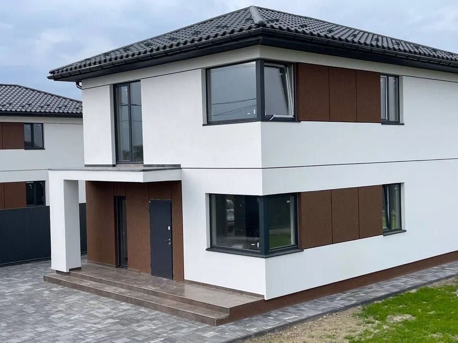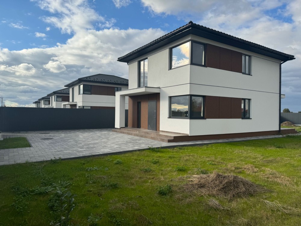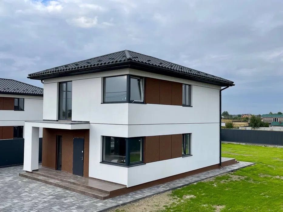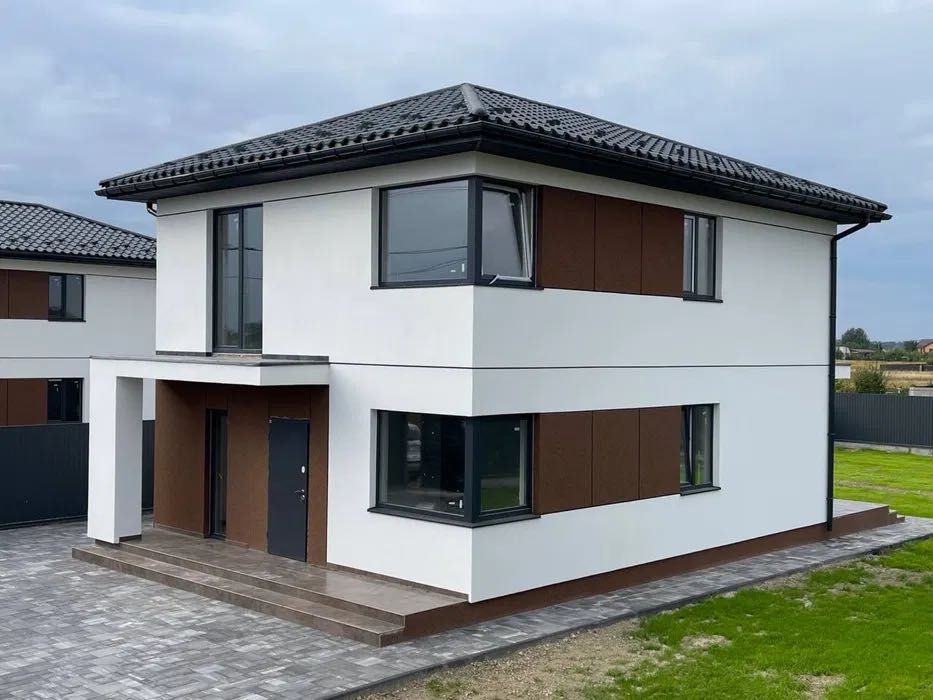 Кожен будинок зі своєю територією 8.3 соток, обладнаною плиткою, місцем для парковки декількох авто та парканом. Зроблені в сучасному європейському стилі, 2023 року будівництва.