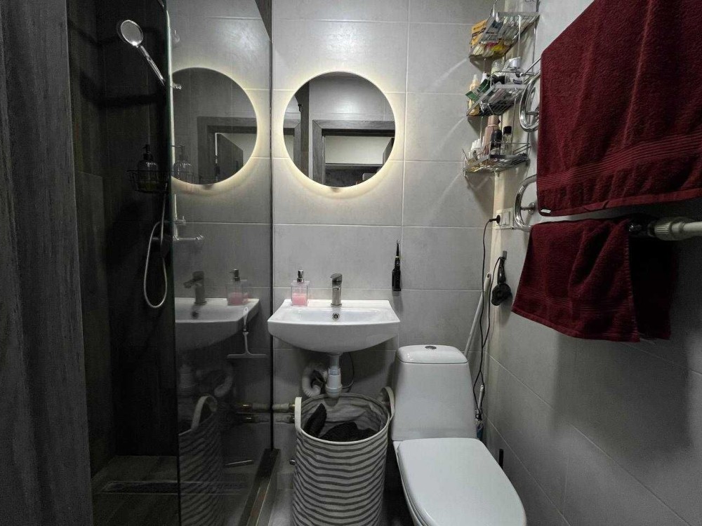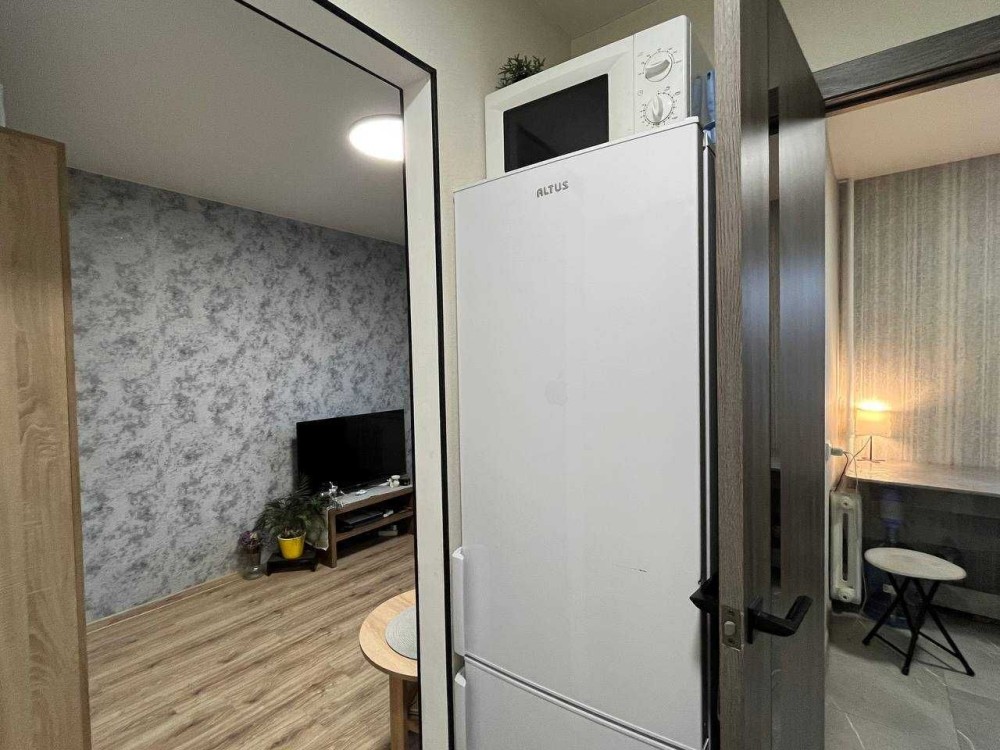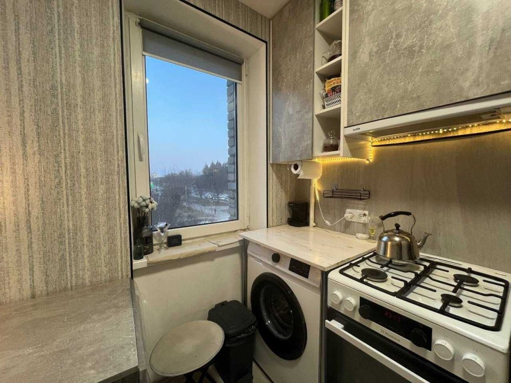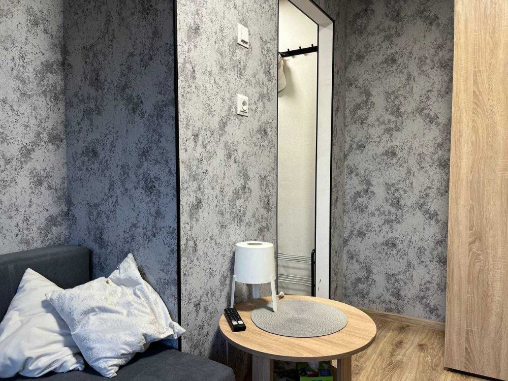 У квартирі: компактна вхідна зона, кімната з розкладним диваном, суміжний санвузол з душовою кабіною, та кухня.