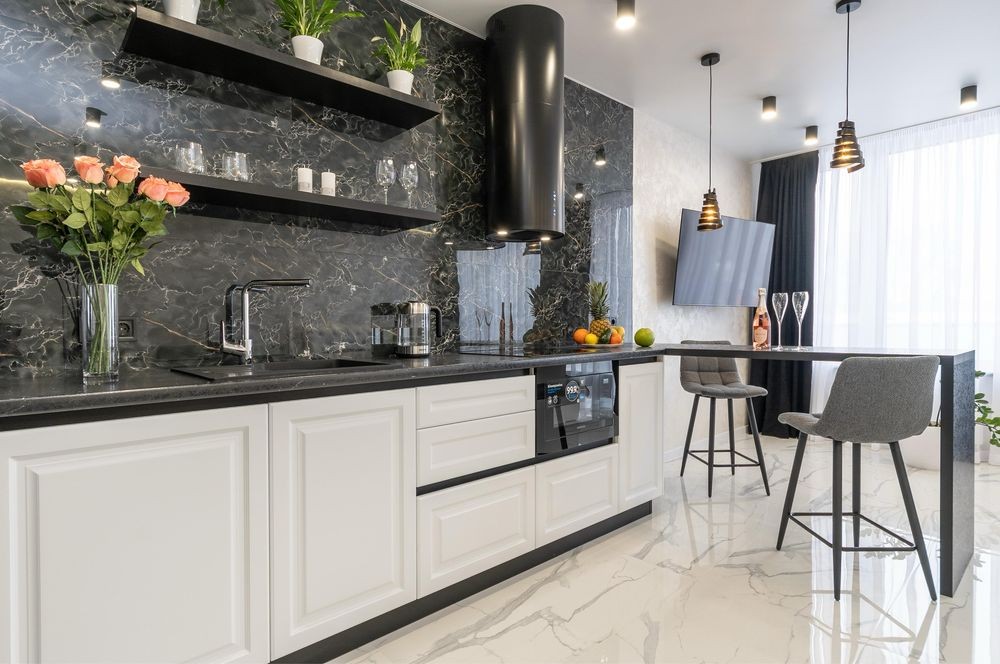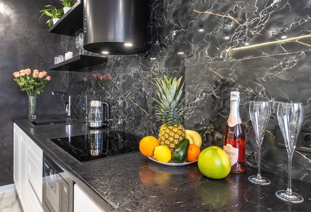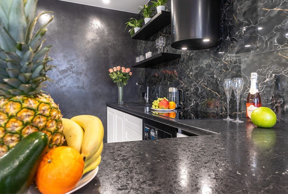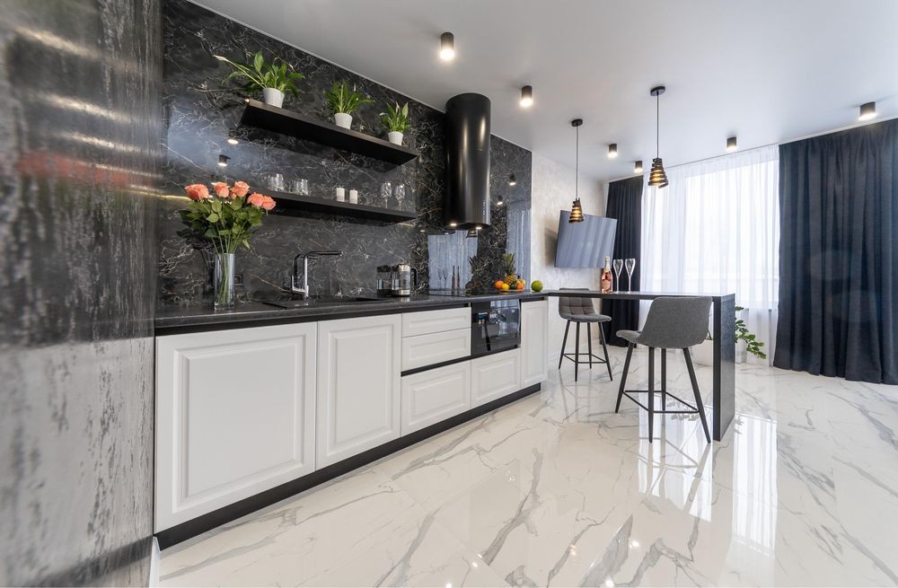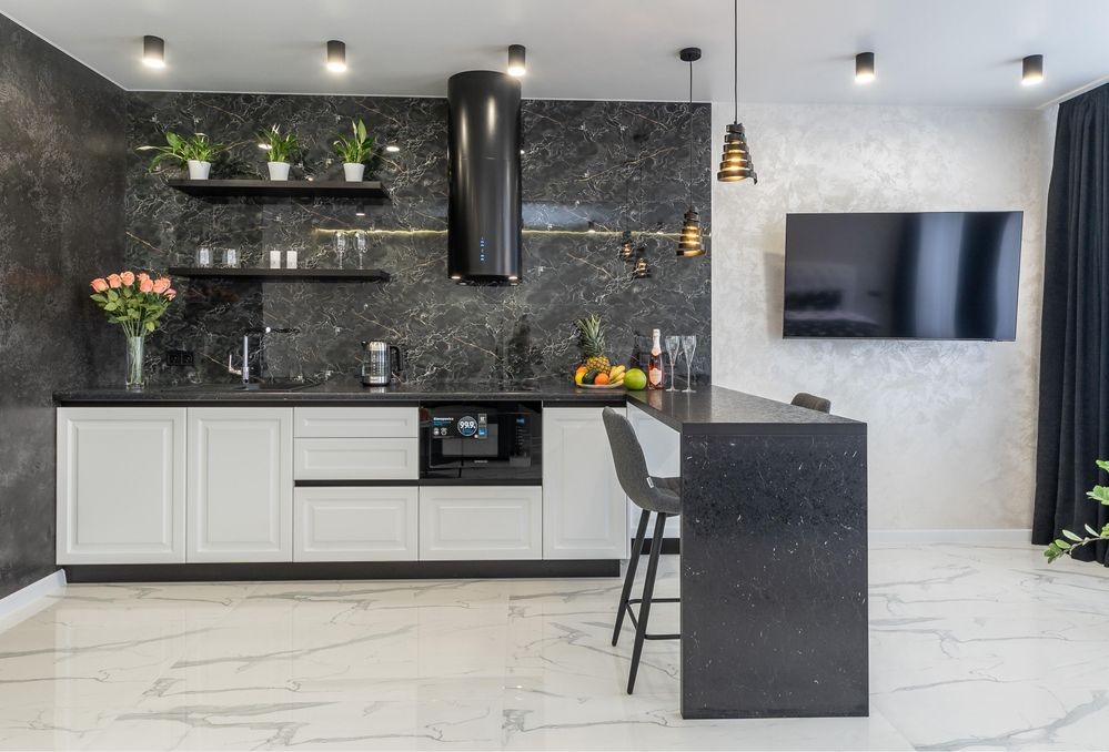 Сучасна кухня обладнана всім необхідним і має барну стійку на 4 стільці, а також окрему обідню зону.