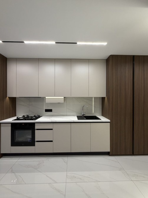 є ліжко, кухня з вбудованою технікою (посудомийна машина, духовка, варильна поверхня, пральна машина), шафа в коридорі.