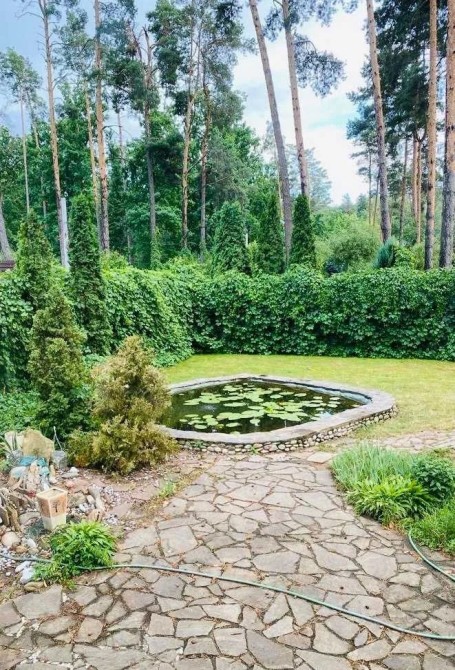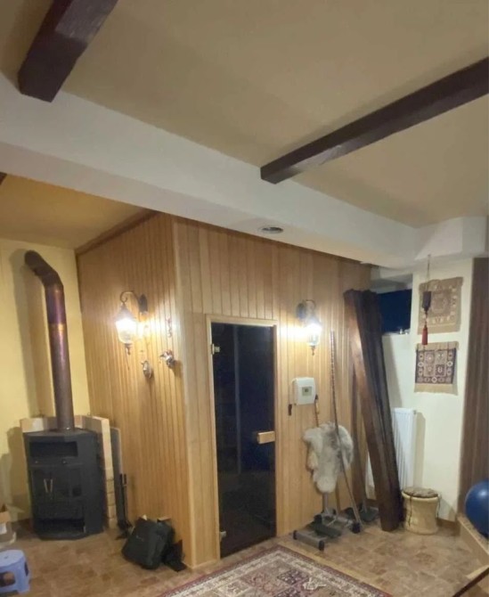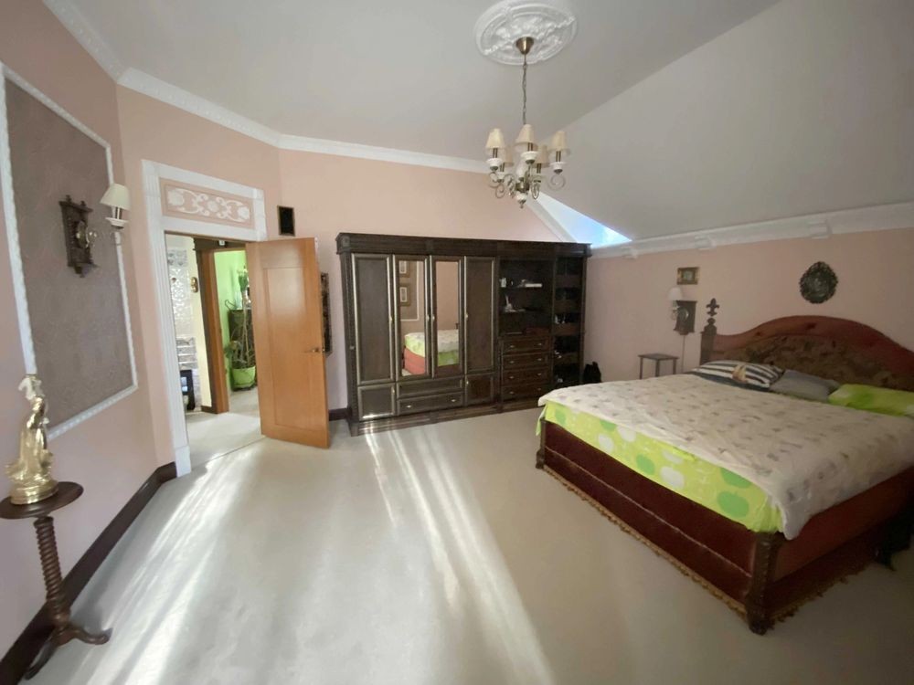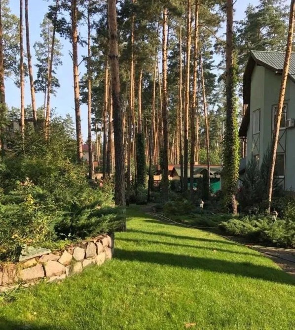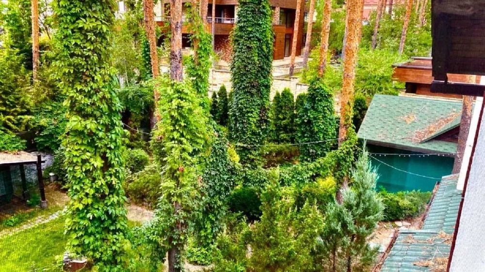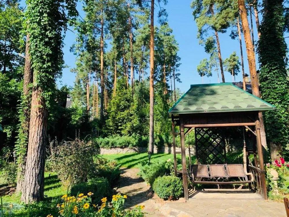 У будинку: камінний зал, кухня, їдальня, 3 спальні, кабінет, 3 з/в, сауна, тренажерний зал, котельня, пральна, крита веранда.