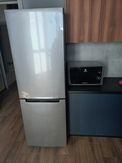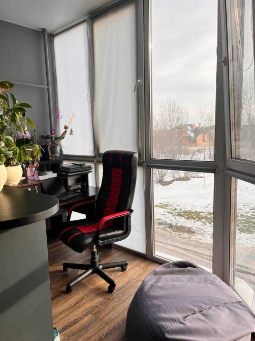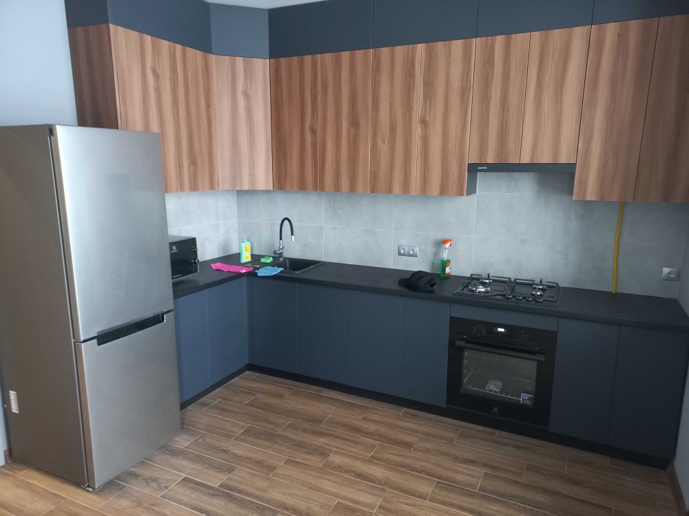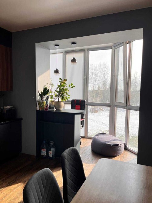Кухня повністю укомплектована: холодильник, плита, витяжка, мікрохвильова піч, подрібнювач відходів, сіл три стільця, барна стійка, яка переходить в балкон з робочою зоною та панорамними вікнами.