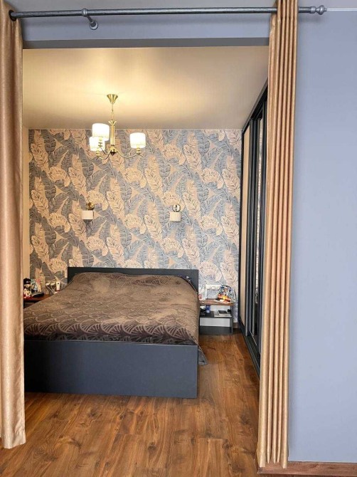Спальне місце розташоване в глуб залу, відділяється шторами та укомплектовано великим двомістним ліжком з тумбочками побокам та та шафою купе.
