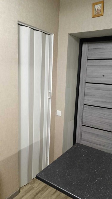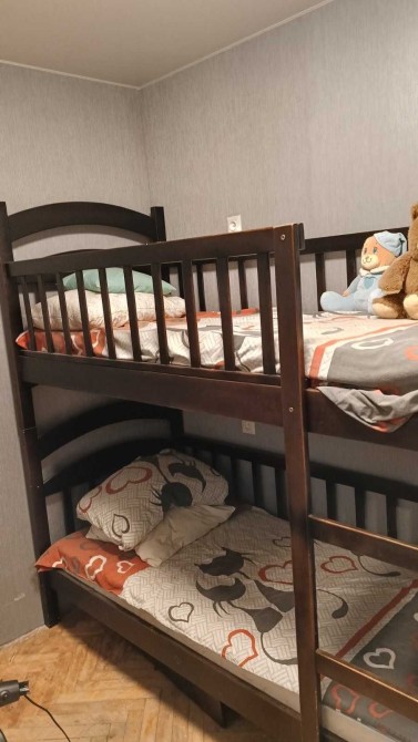 У кімнаті великий холодильник LG, вбудована кухня, великий спальний диван, мікрохвильовка шафа-купе, двоповерхове ліжко, яке можна розібрати на два автономні ліжка.
