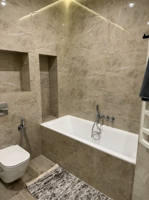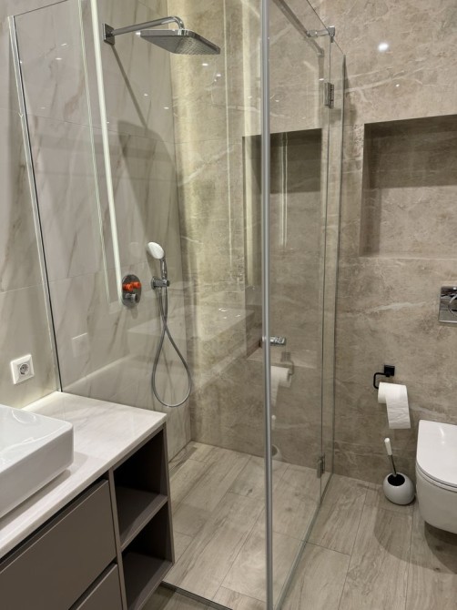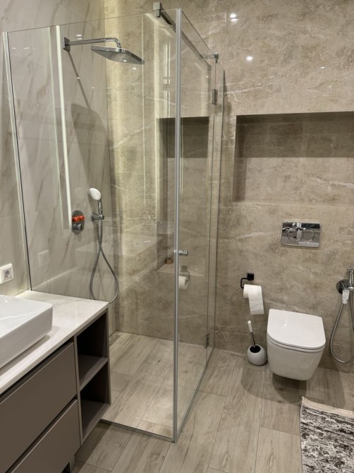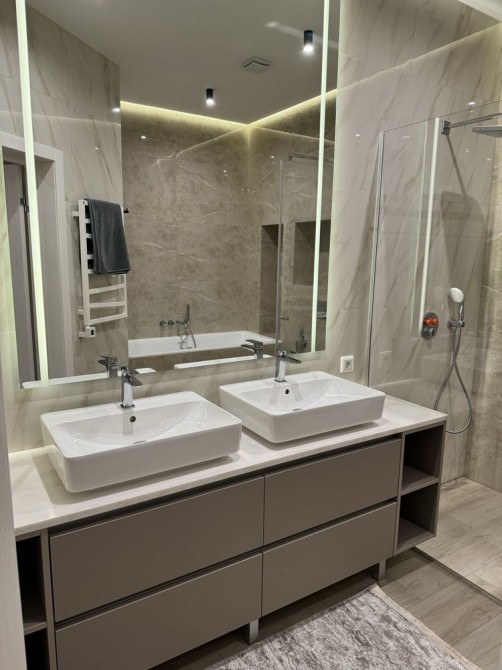 Другий санвузол, ванна, душ, велике дзеркало з підсвіткою, дві раковини, сушарка, туалет та біде.