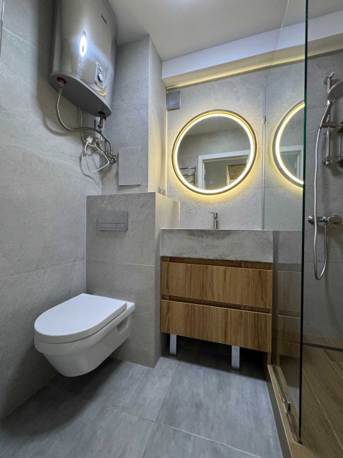 Все продумано для комфортного життя. Укомплектована кухня, туалет і душова з тропічним душем. Є окрема велика кімната з ліжком 180×200, італійським ортопедичним матрацом і шафою, а також маленька кімната з дизайнерським диваном, шафою та плазмовим телевізором. У квартирі: телевізор 43" (QLED), холодильник, диван, варильна поверхня, духова шафа, витяжка, мікрохвильовка, пральна машина, бойлер на 60 л, дві великі шафи, банкетка, дзеркало, тумба для взуття та інтернет, що працює навіть під час вимкнення світла.