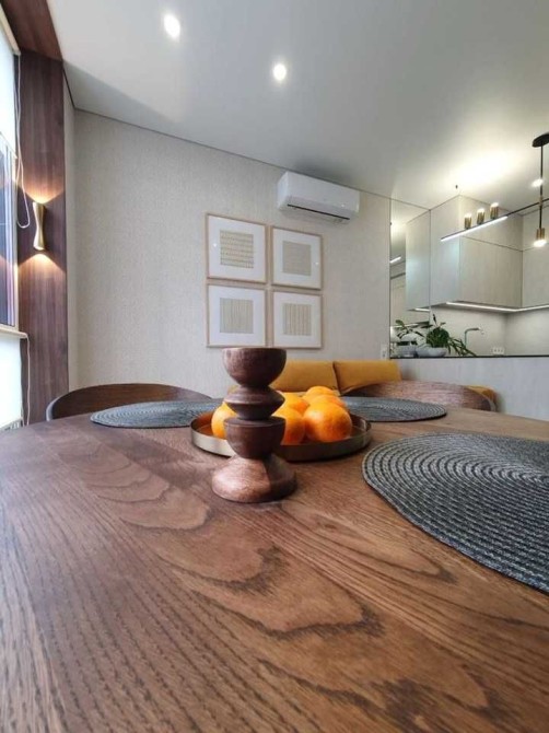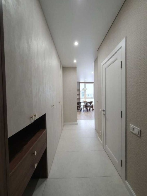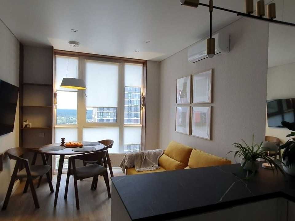 Кухня якісна, вбудована, з італійською стільницею зі штучного каменю, посудомийною машиною Bosch, двокамерним холодильником Siemens, індукційною варильною поверхнею та духівкою Bosch, теплою підлогою. У вітальні встановлений телевізор LG 55" Smart TV, все освітлення — LED.