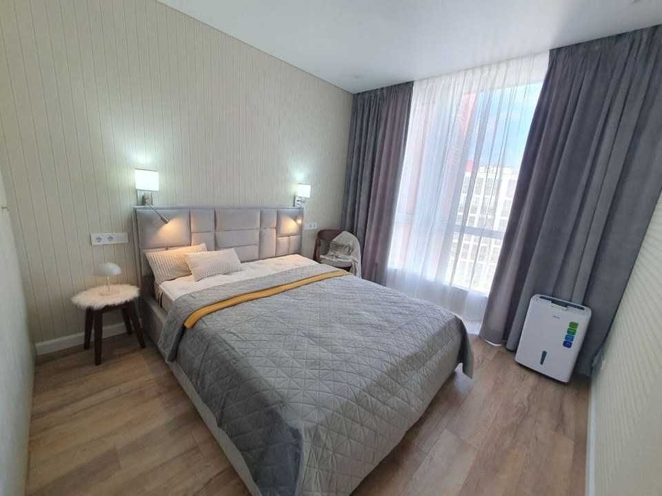 Інтер’єр продуманий для зручного проживання: підлога — ламінат і плитка, у вітальні — розкладний диван на 2 місця та кондиціонер. У спальні — ліжко з ортопедичним матрацом (1800×2000) та нішею для зберігання. Санвузол оснащений бойлером 80 л, змішувачами Hansgrohe, тропічним і гігієнічним душем, ванною. Є пральна і сушильна машини Siemens, тепла підлога.