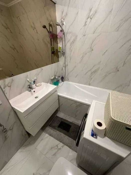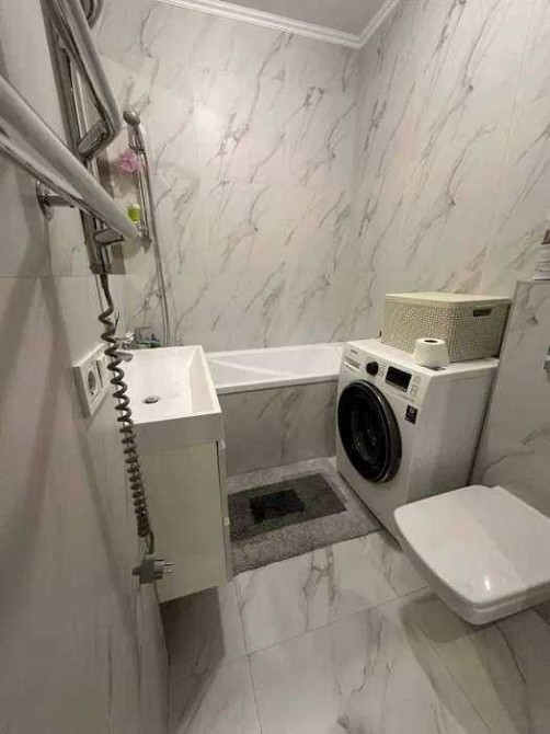 Ванна кімната обладнана ванною, європейською сантехнікою, пральною машиною, бойлером, інсталяцією з підвісним унітазом.