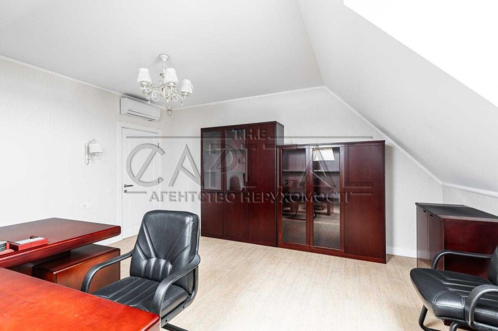 Село Забуччя. 13 км від КП по Житомирській трасі, 19 км від автост.Дачна. 4 км до ЖК Синергія (Ірпінь), 7 км до Бучі. Будинок має 6 кімнат (4 спальні), 2 зали, 4 санвузла, душова. Асфальтований під'Їзд.Будинок під охороною, камери відеоспостереження. Ділянка: Ландшафтний дизайн,басейн, автополив. Відкрита тераса з барбекю. Будинок має мансарду та цокольний поверх. На першому- хол та кухня-студіо, санвузол, туалет та гараж 35 кв.м.. На другому спальня та двоповерховий кабінет, який можно облаштувати під спальню. На третьому кабінет, спальня з санвузлом. Останній поверх- мансарда з санвузлом. На цокольному поверсі велика кімната( під спортзал)де є бігова доріжка, пральна, сауна,душова, техприміщення та 2 кімнати-кладові. На другому поверсі відкрита велика тераса, на третьому балкон. Підлога, керамограніт, плитка, ламінат. Газове опалення, підігрів підлоги на декількох поверхах. камін, сауна. 3 кондіціонера, газовий котел та електроболер. Інтернет оптоволокно.