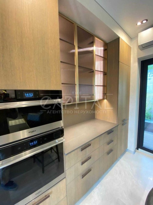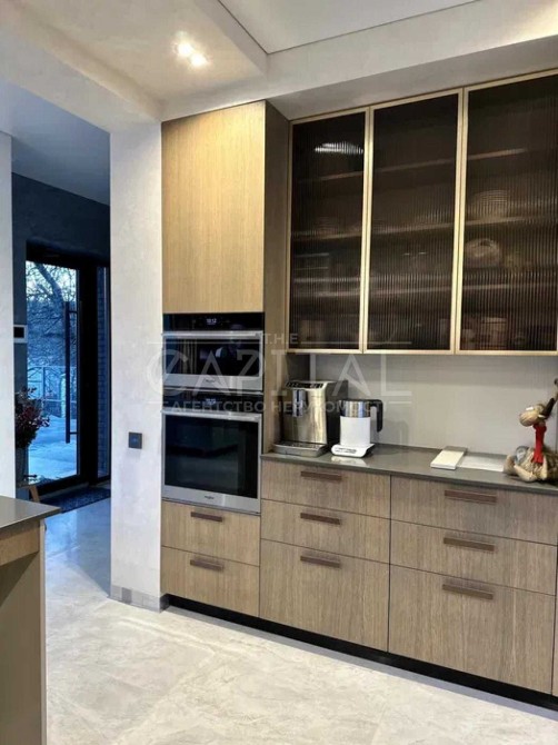 Кухня из шпона дуба, оборудована всей встроенной техникой, индукционной плитой, посудомоечной машиной, доп. системой очистки воды и измельчителем продуктов.