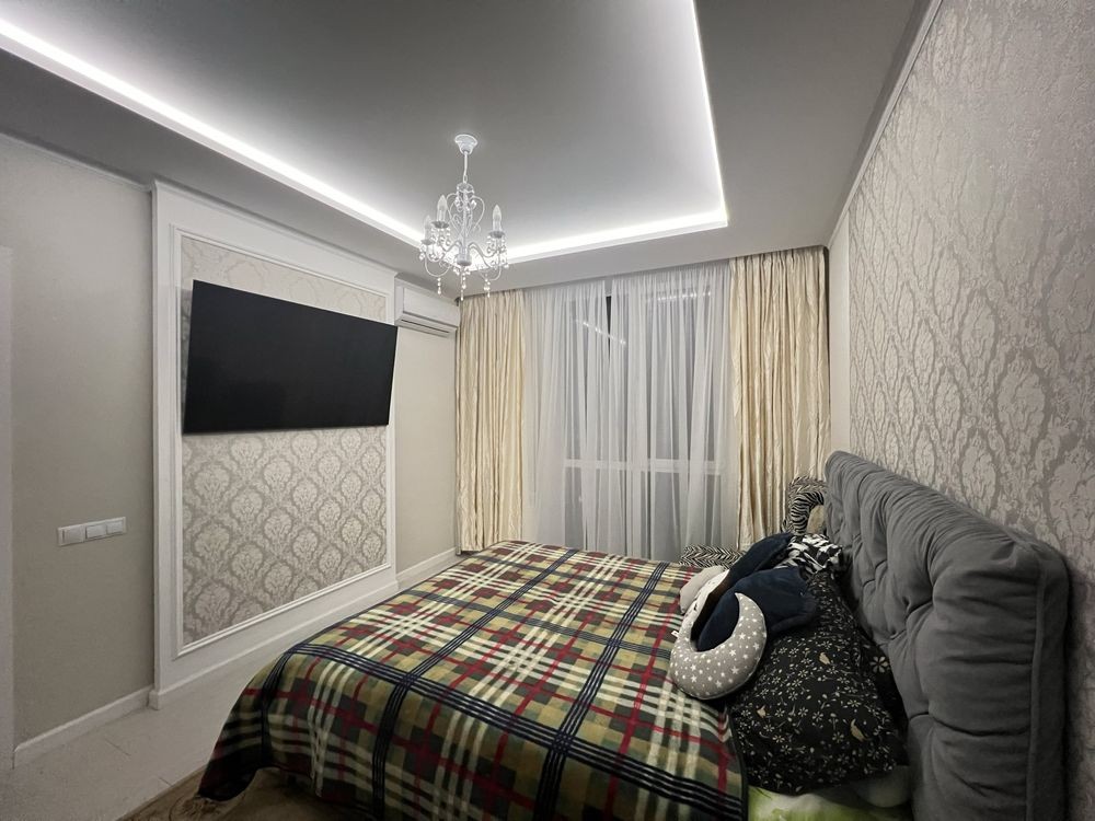 У кімнаті — панорамні вікна з гарним видом, якісний ламінат, вінілові шпалери, натяжні стелі з підсвіткою. Є зручне ліжко, велика вбудована шафа, телевізор, кондиціонер та внутрішньопідлоговий конвектор — усе продумано для комфорту.