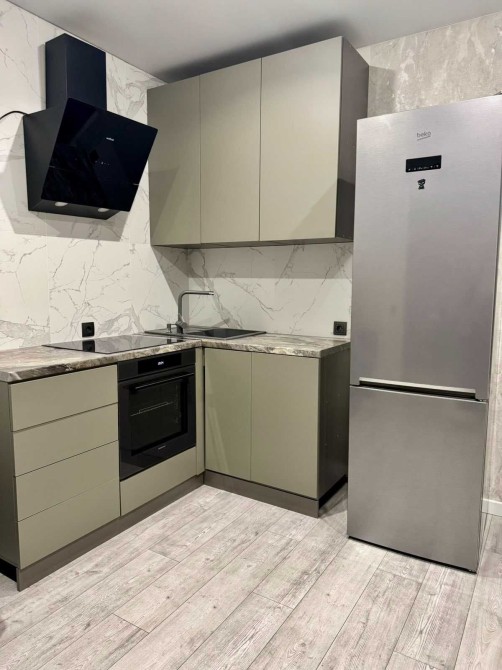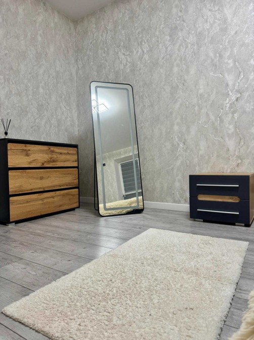 Затишна та світла спальна кімната із двоспальним ліжком та стильними деталями у вигляді підлогового дзеркала з інтегрованою підсвіткою, LED - освітлення. Лаконічна кухня у відтінку хаскі та затишний диван для вечірнього релаксу .
