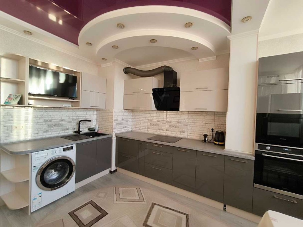 Кухня обладнана всім необхідним: вбудовані шафи, варильна поверхня, духова шафа, витяжка, холодильник, пральна машина.