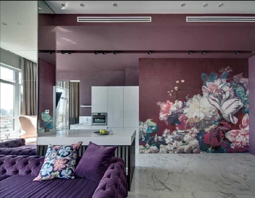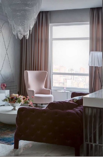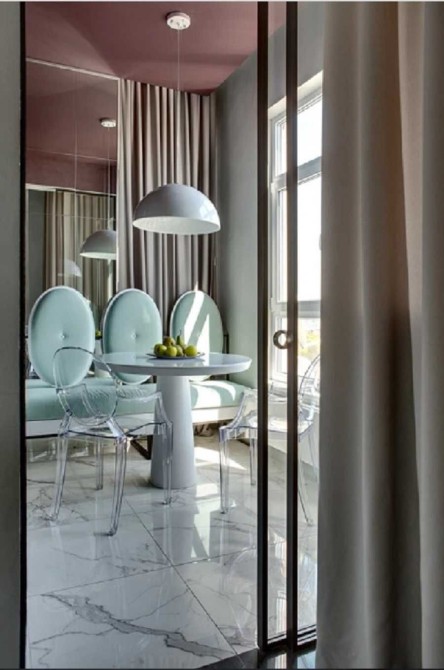 У цьому наповненому повітрям світлому просторі знайшлося місце і масивним темним елементам - велюровий диван інтенсивного кольору збалансував ніжний колір стін у гостьовій зоні.