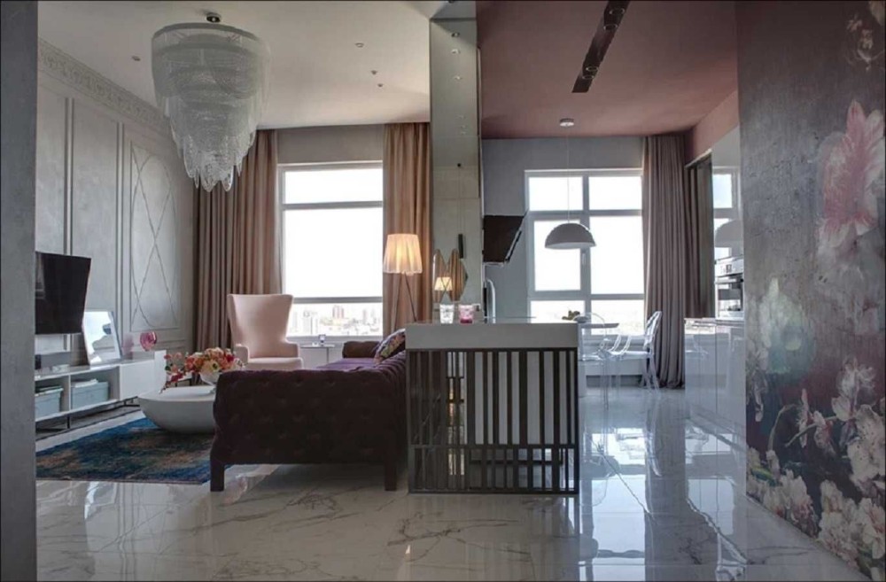 Окрема спальня і ванна з санвузлом. В іншій частині квартири - відкритий простір, що переходить з передпокою в кухню - вітальню, що дозволяє відчути себе відокремлено, без відчуття приготування їжі на транзиті.