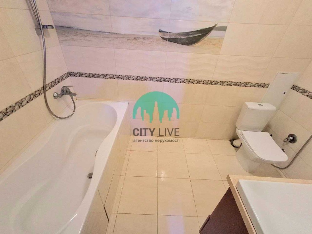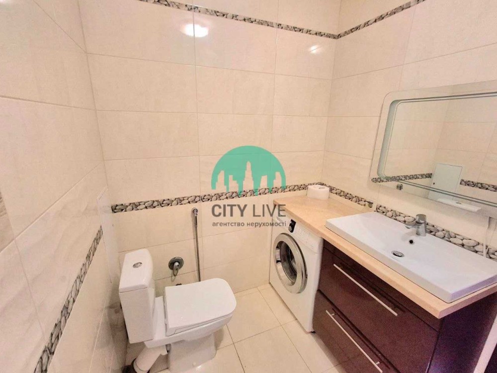 Санвузол суміщений, просторий, виконаний у світлих тонах, обладнаний якісною сантехнікою та зручною системою зберігання.