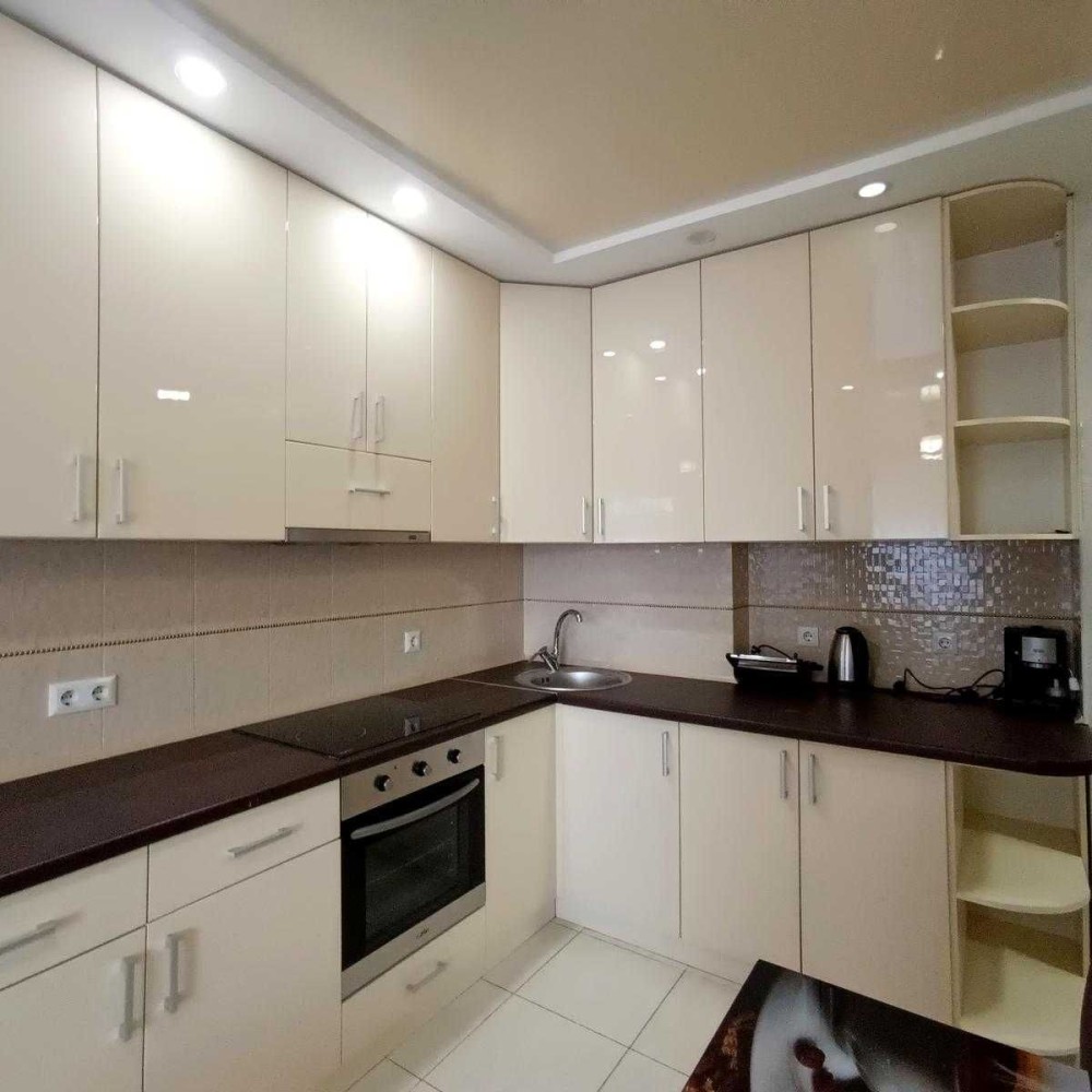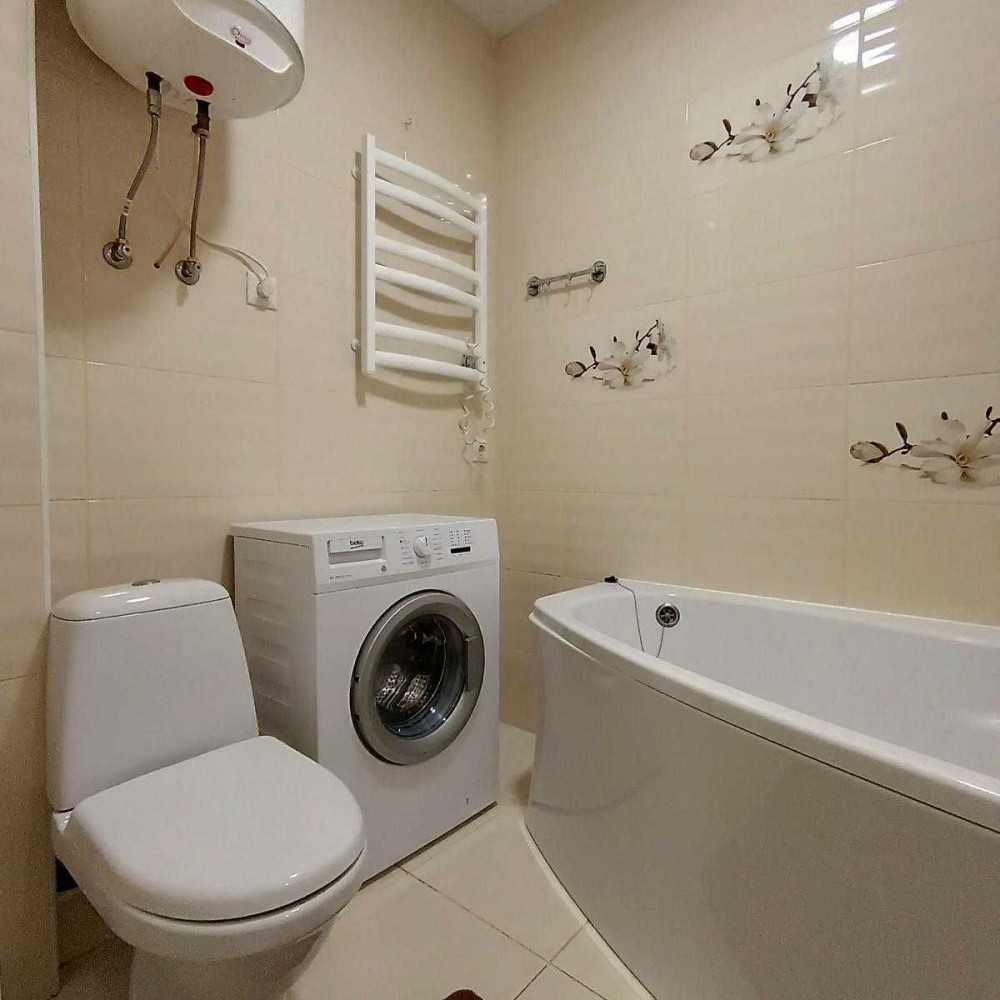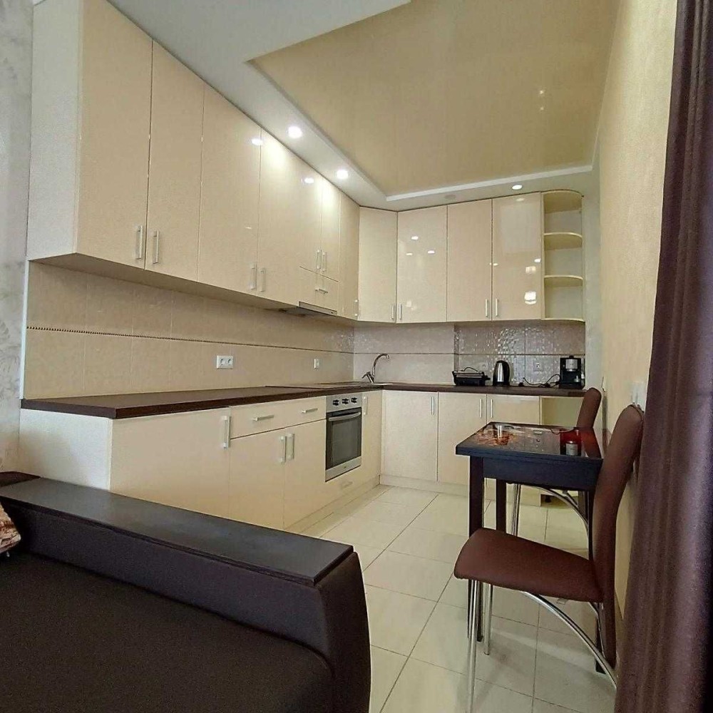Надійні вхідні двері, житлова зона з двоспальним ліжком та диваном, містка шафа, комод та повноцінна кухня з вбудованою побутовою технікою, суміщений санвузол з великою ванною та пральною машиною.