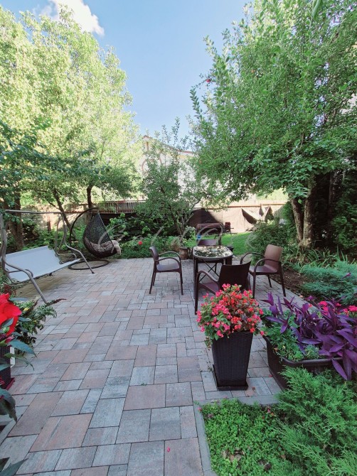 В саду мангал та садові меблі, гойдалки, кокон, шезлонги.