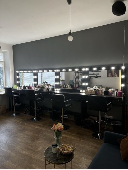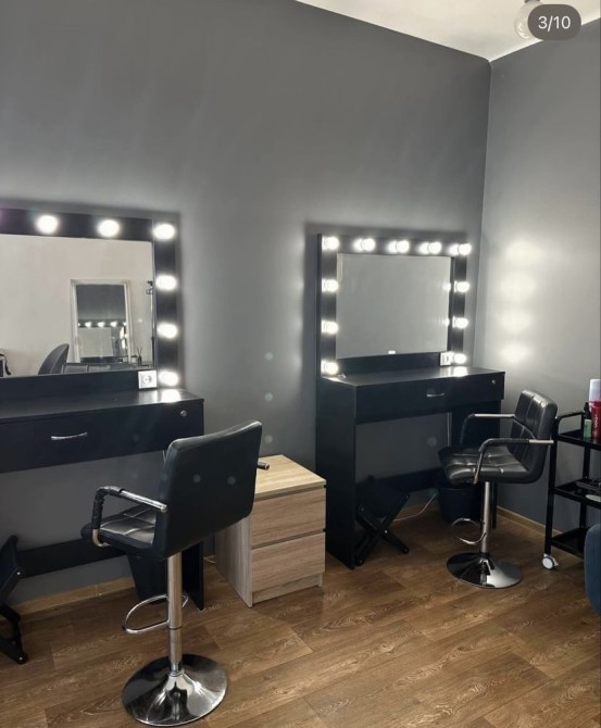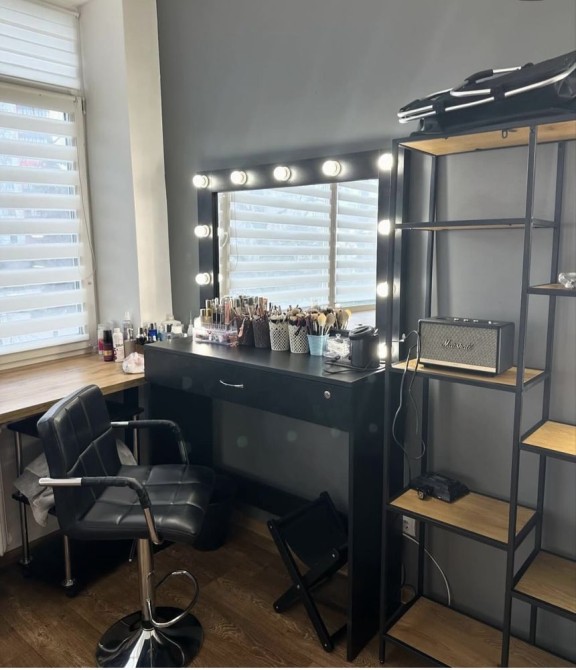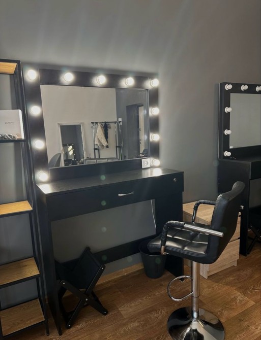 4 візажних столи зі стільцями , підставки для сумок клієнтів та смітники під кожним із столиків