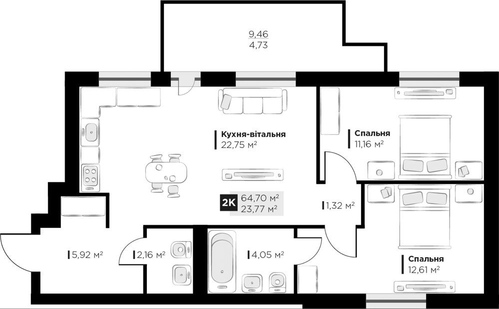 Площа квартири - 65м2