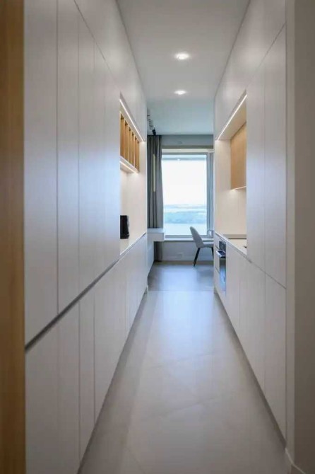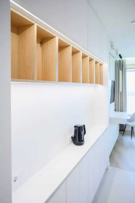 Дизайнерская квартира с умной планировкой и большим количеством встроенных систем хранения.