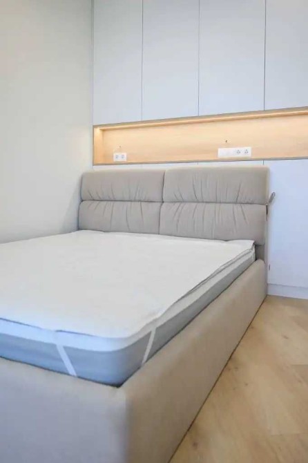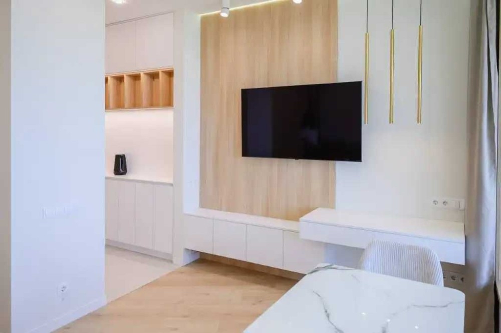 Всё выполнено на заказ: гардеробы, шкафы во всех зонах. В каждой части квартиры предусмотрены розетки, что делает пространство максимально удобным.