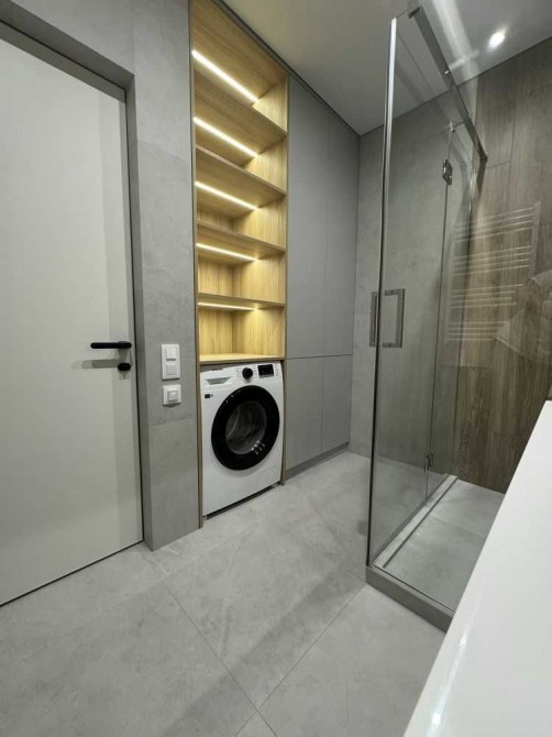 Душова (5,2 м): душова, великий умивальник із тумбою, дзеркало з підсвіткою та електрична рушникосушарка. Прально-сушильна машини Samsung, бойлер на 80л.