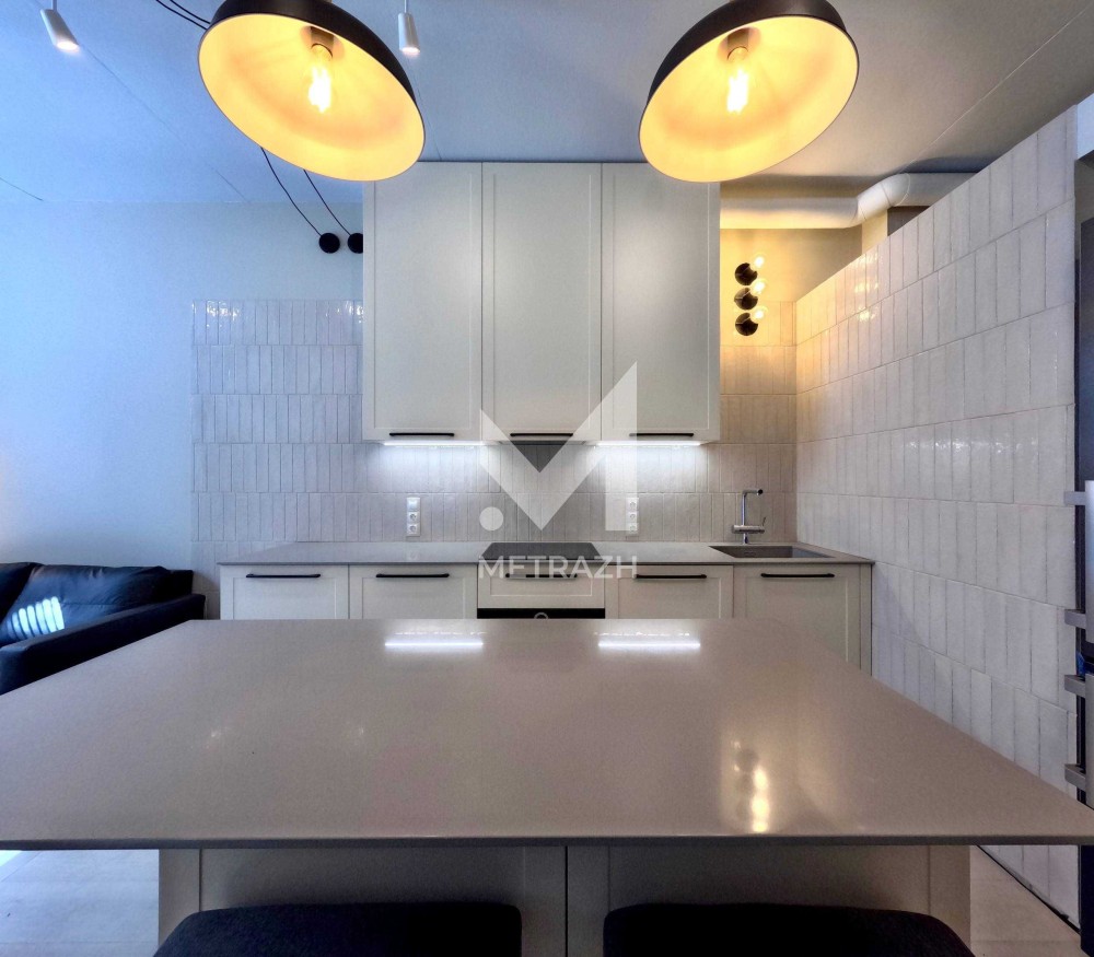 Квартира полностью меблирована и укомплектована премиальной техникой (индукционная поверхность, духовой шкаф, стиральная машина, все фирмы Bosch, смесители Grohe, мойка Franke).